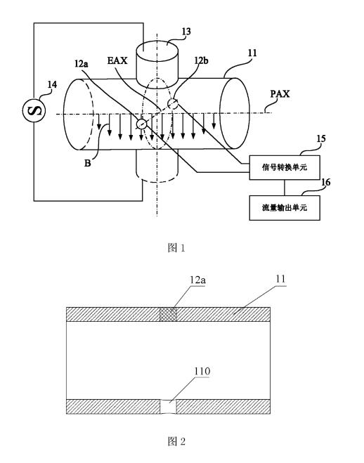 圖1顯示了現(xiàn)有技術(shù)中的一種電磁流量計(jì)的結(jié)構(gòu)。如圖1所示,所述電磁流量計(jì)包括:流動(dòng)有被測(cè)流體的測(cè)量管11,和與被測(cè)流體相接觸且對(duì)向配置在測(cè)量管11上的電極12a、12b,向被測(cè)流體施加磁場(chǎng)的勵(lì)磁線圈13,向勵(lì)磁線圈13供給勵(lì)磁電流、使其產(chǎn)生磁場(chǎng)的電源單元14。另外,所述電磁流量計(jì)還包括:與電極12a、12b連接用于檢測(cè)電極12a、l2b之間的感應(yīng)電動(dòng)勢(shì)的信號(hào)轉(zhuǎn)換單元15,從由信號(hào)轉(zhuǎn)換單元15檢測(cè)出的電極間電動(dòng)勢(shì)計(jì)算出被測(cè)流體的流量的流量輸出單元16應(yīng)用所述電磁流量計(jì),當(dāng)流體在測(cè)量管11中穿過由勵(lì)磁線圈13產(chǎn)生的磁場(chǎng)流動(dòng)時(shí),根據(jù)法拉第定律,就會(huì)在電極12a、12b上產(chǎn)生感應(yīng)電動(dòng)勢(shì),流體的平均流速與電極處感應(yīng)出的電壓之間具有線性關(guān)系,這一關(guān)系可以用下述公式表示:E=K*B*舉V,其中E為所產(chǎn)生的感應(yīng)電壓,K為比例常數(shù),B為磁場(chǎng)強(qiáng)度,D為導(dǎo)管直徑,而V為傳導(dǎo)型流體的平均流速這樣,利用信號(hào)轉(zhuǎn)換單元15和流量輸出單元16,即可測(cè)得與所述感應(yīng)電動(dòng)勢(shì)對(duì)應(yīng)的流體的流速,進(jìn)而獲得流體的流量陶瓷管電磁流量計(jì)傳感器有很多優(yōu)點(diǎn),但電極密封是一個(gè)很大難題。圖2為圖1中沿著與勵(lì)磁線圈13產(chǎn)生的磁場(chǎng)相垂直的平面用以顯示電極布置的剖示圖。如圖2,測(cè)量管11設(shè)有電極插孔110,所述電極插孔110為圓柱形或圓錐形,其厚度大致與測(cè)量管11的壁厚相當(dāng),電極(在這里僅標(biāo)示出電極12a)內(nèi)嵌于測(cè)量管11的電極插孔110中。然而,圖2所示中的電極,只有少數(shù)廠家具備特殊的燒結(jié)技術(shù),在高溫高壓環(huán)境下制作出電極以確保電極不滲漏,實(shí)現(xiàn)難度極大。而采用0型圈等機(jī)械裝配密封,由于陶瓷材料表面一定厚度會(huì)變湖,使用時(shí)間一長,絕緣性就會(huì)下降,影響測(cè)量精度