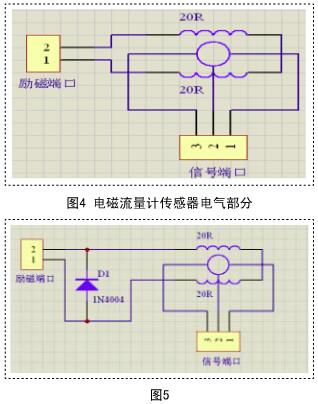 電磁流量計傳感器勵磁電流是產生電火花的危險源,電磁流量計要用于井下,首先得勵磁電路達到本質安全要求。電磁流量計傳感器電氣部分由2個線圈組成,如圖4。