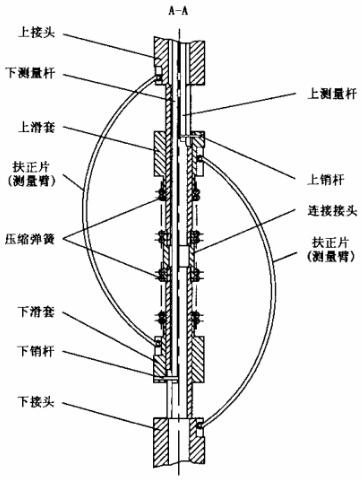 其中上、下接頭與儀器外殼相連,上、下滑套可分別在上下接頭上滑動,測量臂的兩端就分別裝在滑套和接頭上,使之受壓變形后只有一端能動。與滑套相連的是上,下測量桿,二者通過上、下銷村定在一起。當井徑變化引起測量臂壓縮時, 相應的上或下滑套隨之動作,帶動其上的測量桿作軸向運動 ,井徑的變化就轉化為測量桿的位移。由檢測電路檢測這位移 ,就可得到井徑的變化。