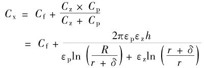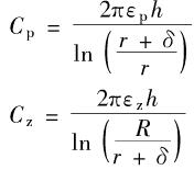 電容中心電極半徑為r,內電極絕緣層厚度為 ,絕緣材料介電常數為 ep,傳感器外電極內表面半徑為R,電極長度為 六,se; 為注入水介電常數,根據同軸柱狀電容器容量計算公式,可得絕緣層和被測介質的電容 Cp、Cz, 為:
