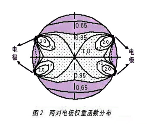傳統(tǒng)點(diǎn)電極電磁流量計(jì)的權(quán)重函數(shù)分布如圖1所示,所繪等權(quán)重函數(shù)線近電極W=2,遠(yuǎn)離電極w=0.65。